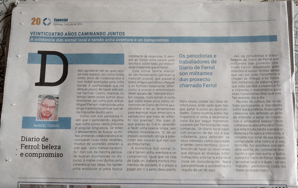O Diario de Ferrol ensinounos a todos que sempre hai un camiño polo que andar, tan importante como as metas que nos propoñemos, que hai alternativas, que somos unha sociedade europea con problemas europeos, que o futuro é un presente continuo que obríganos a dar o mellor de nós. Traballo e esforzo, así é a vida. O seu compromiso e con nós e con ninguén máis.