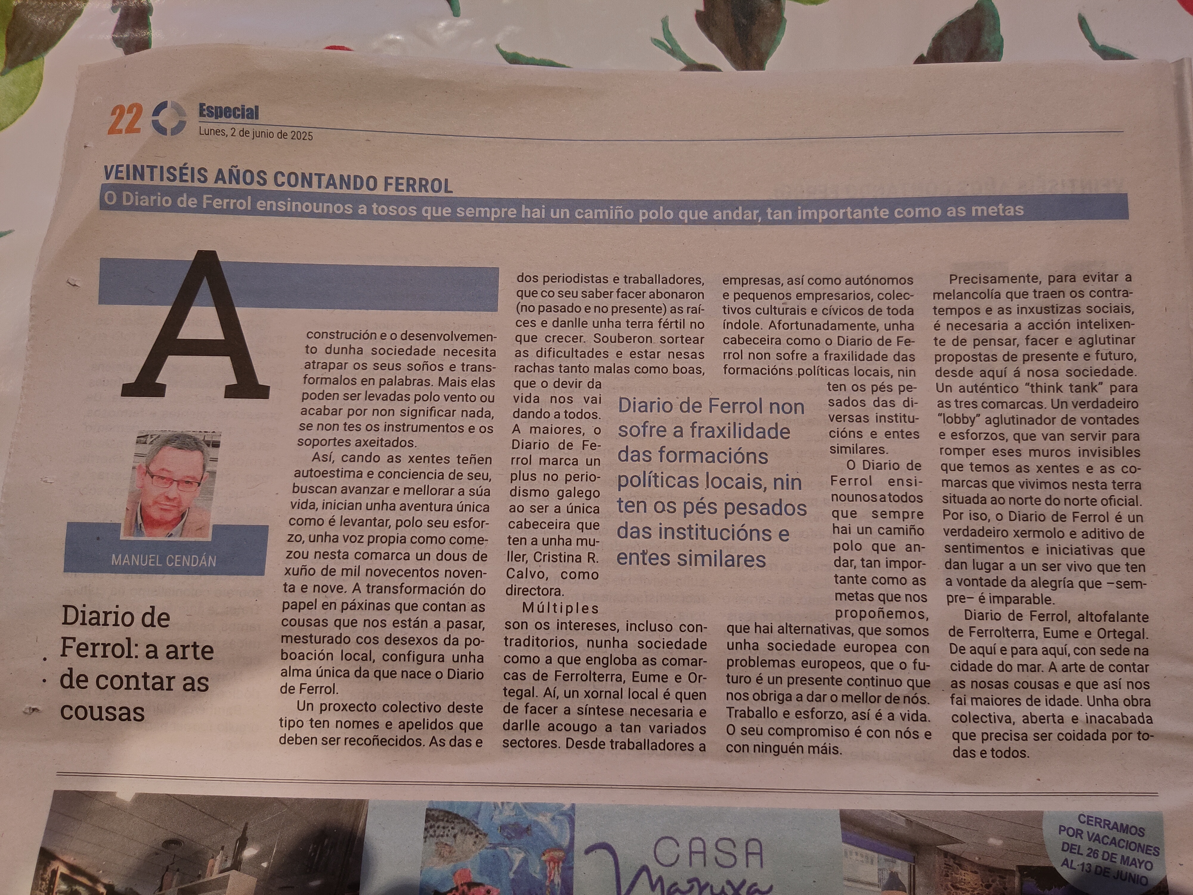 O Diario de Ferrol ensinounos a todos que sempre hai un camiño polo que andar, tan importante como as metas que nos propoñemos, que hai alternativas, que somos unha sociedade europea con problemas europeos, que o futuro é un presente continuo que obríganos a dar o mellor de nós. Traballo e esforzo, así é a vida. O seu compromiso e con nós e con ninguén máis.