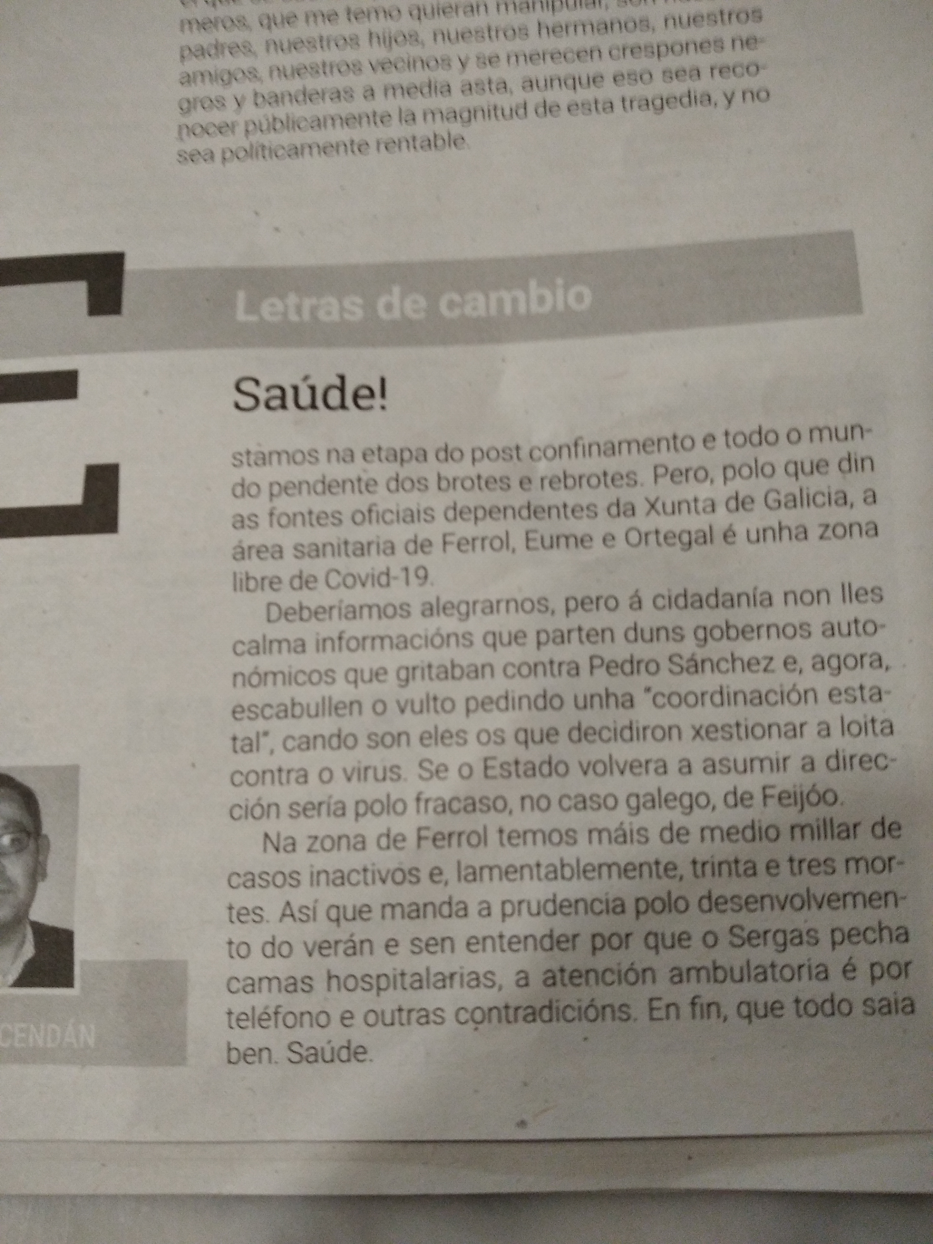 Permítanme dicirlles que con isto da pandemia estou saturado, procuro non ler máis que os titulares que a prensa vai sacando cada día e cústame moito pararme nese tipo de noticias. Pero, non deixo de ver a preocupación da xente, tanto no traballo como na rúa. E cada día que pasa moito máis irascible que o anterior. Agora estamos pagando as mensaxes confusas pola irresponsable oposición dos ultras e da dereita, a diferenza do que pasa en toda Europa occidental.