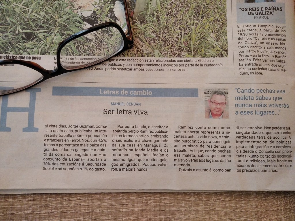 Por outra banda, o escritor e apátrida, Sergio Ramírez publicaba un fermoso artigo lembrando o seu exilio e a chave gardada da súa casa en Managua. Os sefardís na Idade Media e os mouriscos españois facían o mesmo. Igual que moitos galegos emigrados. Poucos volveron, a maioría nunca.