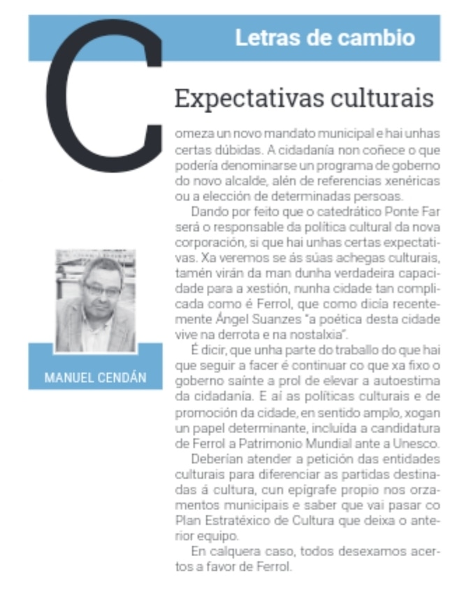 Unha das cousas que quedou listo do mandato municipal anterior é o Plan Estratéxico de Cultura. Dicíase, entón, que se “avogaba por unha política cultural baseada en tres piares metodolóxicos: participación cidadá, planificación estratéxica e transversalidade”. Ferrol foi a primeira cidade galega en presentar unha proposta neste senso.